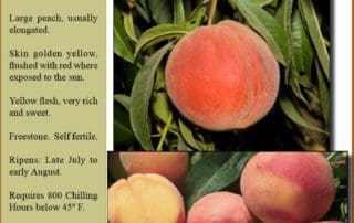 Large fruit with golden-yellow skin blushed red. Sweet yellow flesh. Freestone. Good all-around peach. Chilling Hours: 750 Pollinizer Required? Self-Fertile Ripening Period: Early June