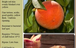Freestone. Medium to large. Resistant to bacterial leaf spot. Acidic, good quality peach with sweet yellow flesh. Chilling Hours: 750 Pollinizer Required? Self-Fertile Ripening Period: Late June